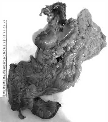 Рис. 2. Фотография удаленного органокомплекса больного А., состоящего из дистального отдела желудка с опухолью, большого и малого сальников, правой половины толстой кишки с регионарными лимфатическими узлами.