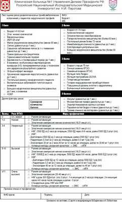 2. Учет всех выявленных индивидуальных состояний, предрасполагающих к развитию тромбоза у конкретного пациента, связанных как с его соматическим статусом, так и с характером выполненного оперативного вмешательства. При это каждому фактору риска присваивается определенное количество баллов, характеризующих его влияние на общий риск тромбообразования. На сегодняшний день наиболее валидированной для индивидуальной оценки риска послеоперационных ВТЭО является модель Caprini, которая была специально модифицирована под нужды нашего стационара. Модель содержит 29 факторов риска, значимость которых эквивалентно выражена в баллах: от 1 до 5.