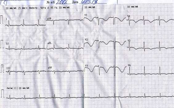 В ходе проведенного обследования, в т. ч. коронароангиография (от 12. 03. 2013) : ПКА сужена в устье на 40%, тип КК правый) и КТ ОГК с контрастированием острая коронарная патология и ТЭЛА были исключены. Коллегиально определена тактика ведения пациентки: т. к. у больной имеет место удлинённый QT (по поводу пароксизмальной форма фибрилляции предсердий ранее принимала соталекс 160 мг х 2 раза), учитывая необходимость антиаритмической терапии для контроля ритма, высокий риск жизнеугрожающих аритмий, а также анамнез больной, решено имплантировать однокамерный ИКД.