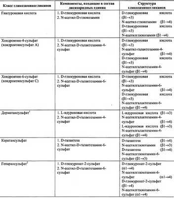 Гликозаминогликаны представляют собой длинные неразветвлённые цепи гетерополисахаридов. Они построены из повторяющихся дисахаридных единиц. Одним мономером этого дисахарида является гексуроновая кислота (D-глюкуроновая кислота или L-идуроновая), вторым мономером — производное аминосахара (глюкоз- или галактозамина). NH2-rpynna аминосахаров обычно ацетилирована, что приводит к исчезновению присущего им положительного заряда. Кроме гиалуроновой кислоты, все гликозаминогликаны содержат сульфатные группы в виде О-эфиров или N-сульфата.