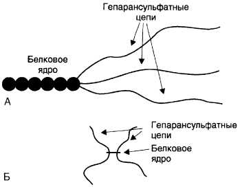 Рис. 15-18. Гепарансульфатсодержащие протеогликаны низкой (А) и высокой (Б) плотности. Гепарансульфатсодержащие протеогликаны высокой плотности имеют звездообразную форму и состоят из четырёх коротких гепарансульфатных цепей, связанных с небольшим белковым ядром. Гепарансульфатсодержащие протеогликаны низкой плотности имеют большое многодоменное белковое ядро, представленное одной по-липептидной цепью. К одному из полюсов ядра прикреплены три длинные гепарансульфатные цепи