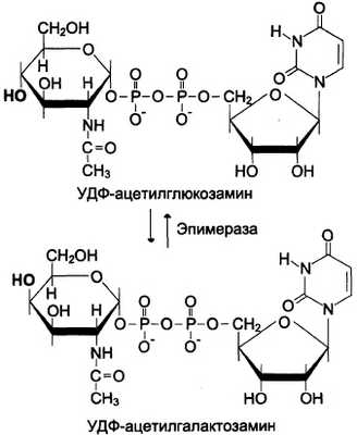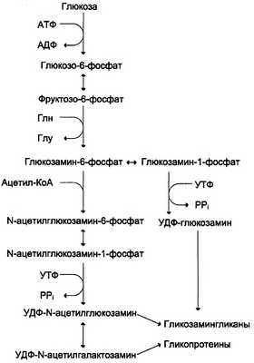 Аминосахара синтезируются из глюкозы; в соединительной ткани -20% глюкозы используется таким образом. Непосредственным предшественником N-ацетилглюкозамина, N-ацетилгалакто-замина и сиаловой кислоты является фрукгозо-6-фосфат. Источником NH2-rpynnы в этих сахарах служит глутамин. Аминосахар далее ацетилируется с помощью ацетил-КоА. Активированными формами этих аминосахаров служат их УДФ-производные (схема, рис. 15-15).