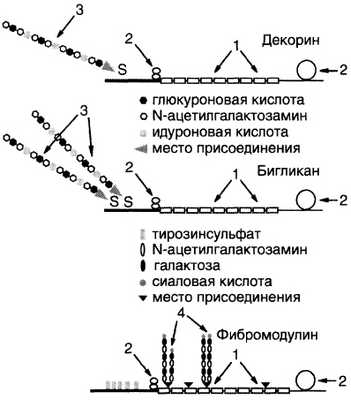 Эти протеогликаны имеют небольшой кодовый белок, к которому присоединены одна или две цепи гликозаминогликанов. Наиболее изучены декорин, бигликан, фибромодулин, лю-микан, перлекан.
