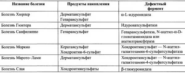 Мукополисахаридозы — наследственные тяжёлые заболевания, проявляющиеся значительными нарушениями в умственном развитии детей, поражениями сосудов, помутнением роговицы, деформациями скелета, уменьшением продолжительности жизни. В основе мукополисахаридозов лежат наследственные дефекты каких-либо гидролаз, участвующих в катаболизме гликозаминогликанов. Эти заболевания характеризуются избыточным накоплением гликозаминогликанов в тканях, приводящим к деформации скелета и увеличению органов, содержащих большие количества внеклеточного матрикса. Обычно поражаются ткани, в которых в норме синтезируются наибольшие количества гликозаминогликанов. В лизосомах при этом накапливаются не полностью разрушенные гликозаминогликаны, а с мочой выделяются их олигосахаридные фрагменты. Известно несколько типов мукополисахаридозов, вызванных дефектами разных ферментов гидролиза гликозаминогликанов. Основные типы мукополисахаридозов приведены в табл. 15-5.