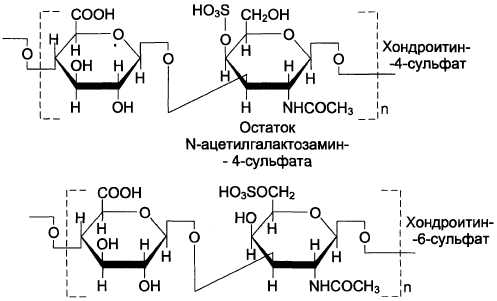 Хондроитинсульфаты — самые распространённые гликозаминогликаны в организме человека; они содержатся в хряще, коже, сухожилиях, связках, артериях, роговице глаза. Хондроитинсульфаты являются важным составным компонентом агрекана — основного протеогликана хрящевого матрикса. В организме человека встречаются 2 вида хондроитинсульфатов: хондроитин-4-сульфат и хондроитин-6-сульфат. Они построены одинаковым образом, отличие касается только положения сульфатной группы в молекуле N-ацетилгалакгозамина (см. схему А).