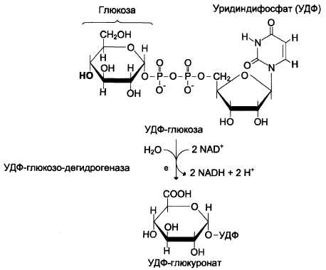Источниками глюкуроновой кислоты в организме человека могут быть пища, внутриклеточное лизосомальное разрушение гликозаминогликанов и синтез глюкуроновой кислоты. Активированная форма глюкуроновой кислоты (УДФ-глюкуронат) образуется при окислении УДФ-глюкозы (см. схему Е).