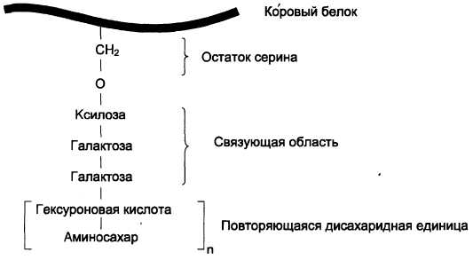 Полисахаридные цепи гликозаминогликанов практически всегда связаны с белком, который называется коровым, или сердцевинным. Присоединение полисахарида к белку осуществляется через связующую область, в состав которой чаще всего входит трисахарид галактоза-галактоза-ксилоза (рис. 15-14).
