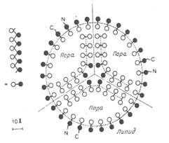 Порины образуют поры, которые функционируют как молекулярные сита, опосредуя диффузию небольших гидрофильных молекул через наружную мембрану грамотрицательных бактерий. Молекулярная масса поринов варьирует от 28000 до 48000. В мембране обычно присутствуют в виде триммеров. Для поринов характерно высокое (до 60%) содержание β-слоев. Наиболее полно к настоящему времени охарактеризованы порины из Escherichia coli: ОmpF (порин матрикса), ОmpС, РhoE, LamB (мальтопорин). Эти белки имеют молекулярную массу ~35000. Их основной особенностью является то, что они образуют наполненный водой трансмембранный канал, причем этот канал образован в основном β-структурами. На рис.4. представлена одна из возможных моделей образования поринового канала из амфифильных β-цепей.