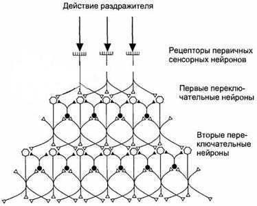 Сенсорные нейроны низшего иерархического уровня способны передавать электрические сигналы одновременно нескольким нейронам следующего уровня благодаря дивергенции к ним своих аксонов. Это повышает надежность передачи информации от одного иерархического уровня к другому и позволяет сохранять чувствительность сенсорной системы при утрате отдельных нейронов. Возбуждение нейронов более высокого иерархического уровня определяется не только действием на них нейронов предыдущего уровня, но и механизмом латерального торможения, существующего в переключательных ядрах (рис. 12.3).