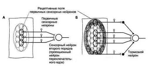 Рис. 12.2 Рецептивные поля первичных сенсорных нейронов и сенсорных нейронов второго порядка. А. Рецептивные поля первичных сенсорных нейронов ограничены областью их чувствительных окончаний. Рецептивное поле переключательного нейрона образуется из суммы рецептивных полей конвергирующих к нему первичных сенсорных нейронов. Б. Раздражение центральной или периферической области рецептивного поля сенсорного нейрона второго и следующих порядков сопровождается противоположным эффектом.
