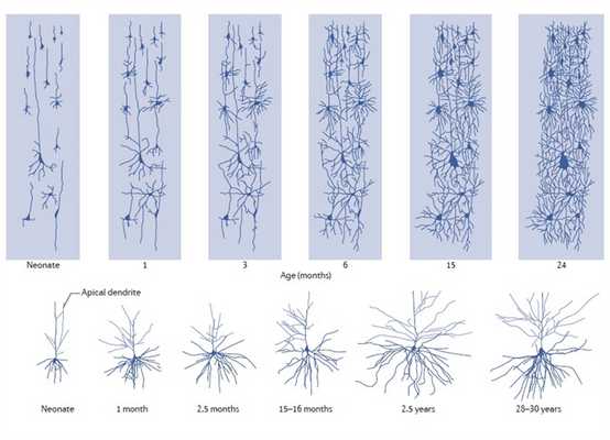 Описательные исследования показали нам, что головной мозг с момента рождения до года претерпевает множество изменений: быстрый рост серого вещества, миелинизация, развитие мозговых структур, гирификация. После двух лет процесс развития замедляется.