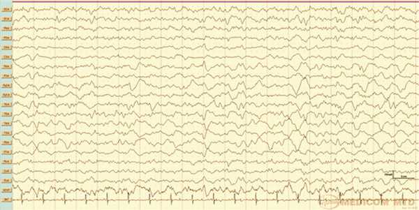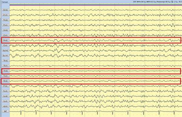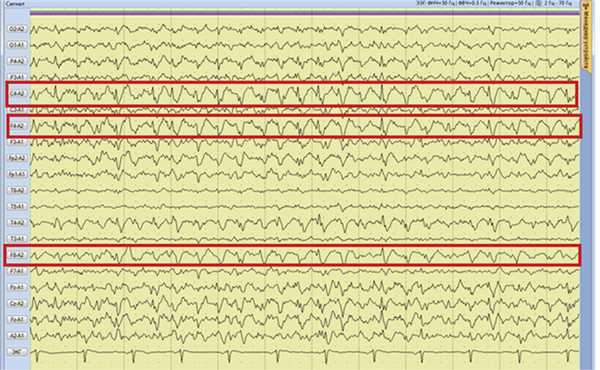 Рис. 6. Наблюдение 2. Фрагмент ЭЭГ-мониторинга. Умеренновыраженный дезорганизованный фон, с преобладанием медленных форм активности и острых потенциалов в лобно-передневисочной области, больше справа.