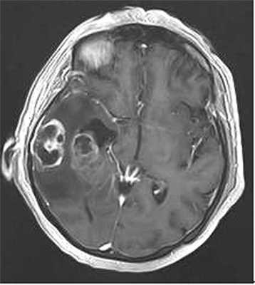 Наблюдение 1. У пациентки 70 лет за 2 мес до госпитализации появилась и стала нарастать слабость в левых конечностях, ухудшилась память на текущие события, снизилась критика собственного состояния. При магнитно-резонансной томографии (МРТ) была диагностирована внутримозговая опухоль правой височной доли с зоной перифокального отека (рис. 1).