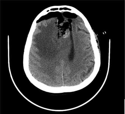 Рис. 5. Наблюдение 2. СКТ в 1-е часы после удаления опухоли левой лобной доли. Послеоперационные изменения с зоной перифокального отека, скопления воздуха и небольшой зоной имбибиции кровью в области операции.