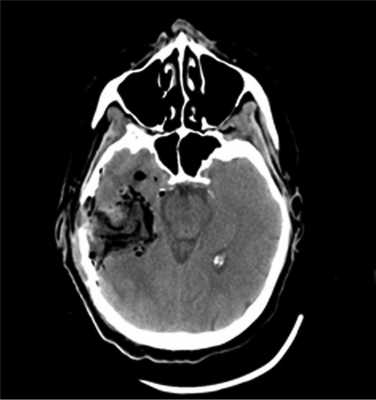 Рис. 2. Наблюдение 1. СКТ в 1-е сутки после удаления опухоли правой височной доли. Выявлены послеоперационные изменения в зоне хирургического вмешательства.