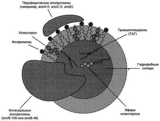 - фосфолипидами и холестеролом. Гидрофильные группы этих молекул обращены к водной фазе, а гидрофобные части - к гидрофобному ядру липопротеина, в котором находятся транспортируемые липиды. Некоторые апопротеины интегральные и не могут быть отделены от липопротеина, а другие могут свободно переноситься от одного типа липопротеина к другому. Апопротеины выполняют несколько функций: