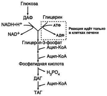 Синтез жиров происходит в абсорбтивный период в печени и жировой ткани. Непосредственными субстратами в синтезе жиров являются ацил-КоА и глицерол-3-фосфат. Метаболический путь синтеза жиров в печени и жировой ткани одинаков, за исключением разных путей образования глицерол-3-фосфата.