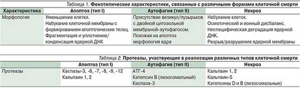 Клеточная смерть классифицируется на три типа: апоптотический (тип I), аутофагический (тип II) и некротический/онкотический (тип III). В зависимости от природы поражения смерть нейронов происходит по одному из этих механизмов, благодаря чему процесс может прогрессировать или прекращаться. Некроз и апоптоз нейронов были хорошо изучены. В последние годы исследователи получают все большее количество свидетельств о вовлеченности в процесс гибели клеток аутофагии и аутофагии-ассоциированной клеточной смерти. При этом для каждой формы клеточной смерти характерны свои биохимические маркеры (табл. 1, 2).