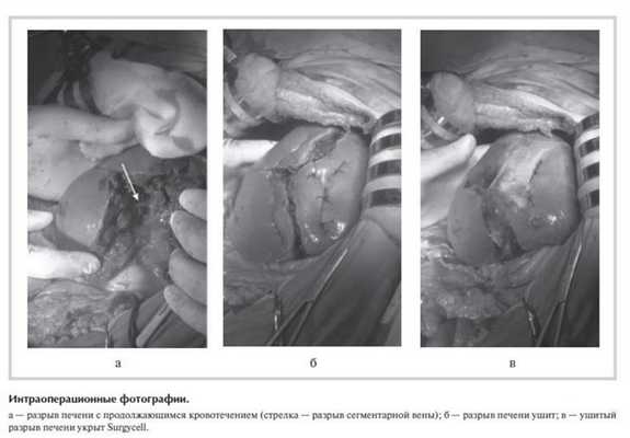 Паренхиматозное кровотечение с поверхности печени остановлено электрокоагуляцией в биполярном режиме и "припудриванием" гемостатическим агентом Procol. С учетом перехода разрыва на висцеральную поверхность S4 печени близко от желчного пузыря выполнена холецистэктомия от шейки с раздельной перевязкой пузырного протока и артерии. Края разрыва печени сведены отдельными П-образными швами полигликолидом USP 0 на атравматической игле (см. рисунок б ), после чего линия швов укрыта гемостатическим агентом Surgycell (см. рисунок в ). Операция закончена дренированием брюшной полости и послойным ушиванием раны. Длительность операции 165 мин. Суммарная кровопотеря составила 1550 мл, собрано и реинфузировано аппаратом CellSaver 290 мл аутоэритроцитов.