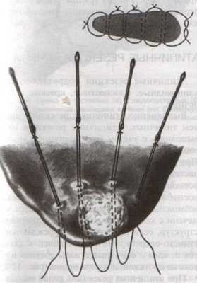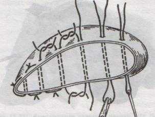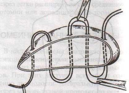 1. Используется толстый кетгут и металлические пуговчатые зонды с ушками (или более современные гирляндные атравматические нити с металлической и пластмассовой оконцовкой).