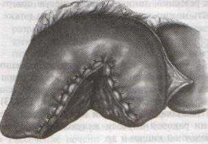 б) наложение гемостатических швов печени (Кузнецова-Пенского, Оппеля, Джордано и др.). Для предупреждения прорезывания печеночной ткани используют в качестве прокладок сальник, глиссонову капсулу с удаляемого участка печени, серповидную связку, синтетические материалы
