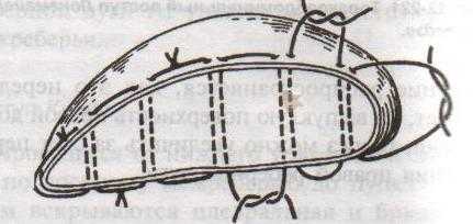 3. Первый шов затягивают, второй оставляют не затянутым, накладывают третий шов и т.д.