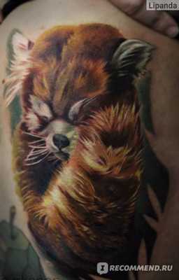 Вторая моя любимая татуировка была набита по бартеру, я особо не думала об эскизе, он был выбран чуть ли не перед сеансом, но я давно хотела набить красную панду, поэтому звёзды сошлись, а я получила обновку. Мой второй мастер делал красивые работы в реализме, поэтому оставалось найти нужную фотографию в интернете. Недолго выбирая, мне предложили милое фото, я согласилась и уже к ночи заимела вот это чудо (работа в два сеанса):
