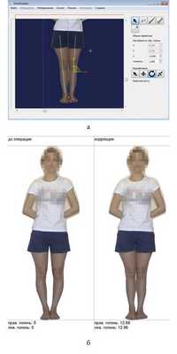 Кроме того, производили измерение уровня скоса суставной площадки медиального мыщелка большеберцовой кости. Несомненно, данный диагностический критерий важен в выявлении дисплазии. Скос определяется на рентгеновских снимках как наличие двух контуров суставной поверхности. Устанавливали расстояние от вышележащего до нижележащего контура. Проводили антропометрические исследования пациентов, включающие измерение роста, длины и окружности голеней, расстояния между мыщелками бедер. Наружную торсию голени определяли как угол отклонения продольной оси стопы от сагиттальной плоскости при установке коленных суставов с ориентацией надколенников строго фронтально. Пациентам предлагалось выполнить автоматизированную диагностику стопы [9]. Проводили фотопараметрическую компьютерную визуализацию антропометрического статуса в стандартном положении (пациент находится в вертикальном положении, лодыжки сомкнуты, коленные суставы максимально разогнуты, вес тела равномерно распределен на обе нижние конечности), по результатам которой производили компьютерное моделирование планируемого результата (рис. 3, а,