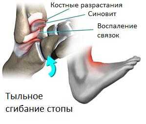 С течением времени постоянные микроповреждения приводят к разрастанию рубцовой и фиброзно-хрящевой ткани в области переднего отдела большеберцово-таранного сустава, ущемление которой при тыльном сгибании стопы и приводит к боли.