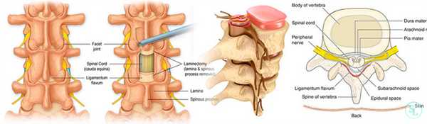 - интерламинарная ламинэктомия - способ, при котором частично резецируется желтая связка, а также дуга не только пораженного позвонка, но и дужки позвонковых тел, прилежащих к нему;