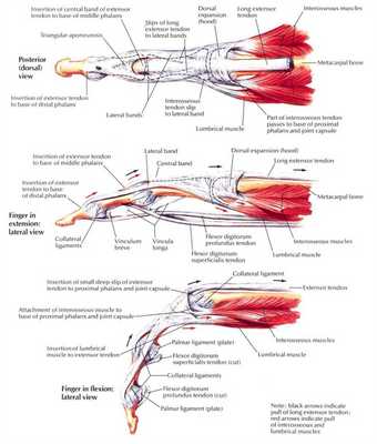 Сухожилия экстензоров находятся в дорсальном отделе кисти и пальцев. Функция этих сухожилий заключается в разгибании запястья и пальцев. Согласно Кляйнерту и Вердану (1983) существует восемь анатомических зон, на которые делится разгибательный механизм: