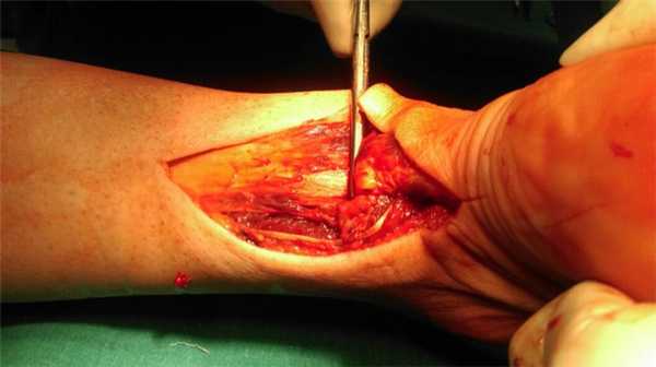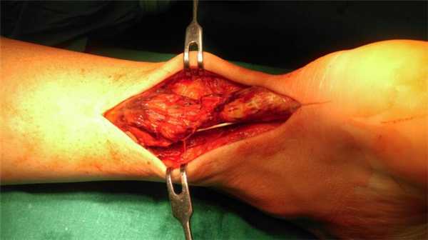 В нашу клинику пациентка обратилась спустя 6 месяцев после травмы. На таких сроках во время операции всегда возникает проблема адаптации концов сухожилия. Возникает необходимость выполнения сухожильной пластики и аугментации шва аутотрансплантатом или транспозиции сухожилия длинного сгибателя большого пальца. Также возможно использование перевёрнутых лоскутов, пластика по Чернавскому, или аутотрансплантата из сухожилия полусухожильной мышцы.