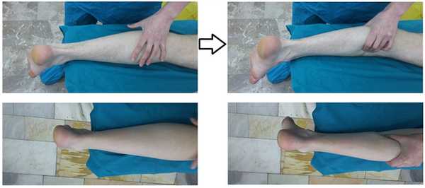 При осмотре обратили на себя внимание выраженная атрофия икроножной мышцы, пастозность в зоне расположения ахиллова сухожилия. Тест пассивной плантарфлексии выявил значительные различия в положении стопы при расслабленном положении.