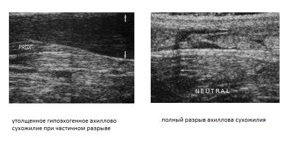 Клинический осмотр и применение диагностических тестов позволяют точно установить диагноз у 70% больных. На помощь специалисту приходят такие методы как сонография (УЗИ) и МРТ. Сонография - очень точный, быстрый, малоинвазивный и дешёвый метод диагностики разрывов ахиллова сухожилия - но только в руках опытного специалиста. Позволяет отличить частичные и полные разрывы.