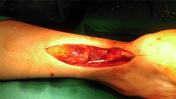 При ревизии определяется значительный дефект ахиллова сухожилия заполненный грануляционной тканью (на протяжении 5 см), что объясняло отсутствие возможности пальпировать дефект.