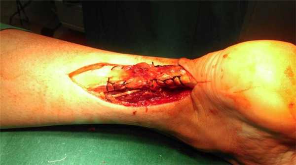 Использование V-Y пластики и ткани сухожилия длинного сгибателя большого пальца позволили сформировать в месте дефекта сухожилия мощный конгломерат тканей, который в дальнейшем должен перестроиться в новое ахиллово сухожилие.