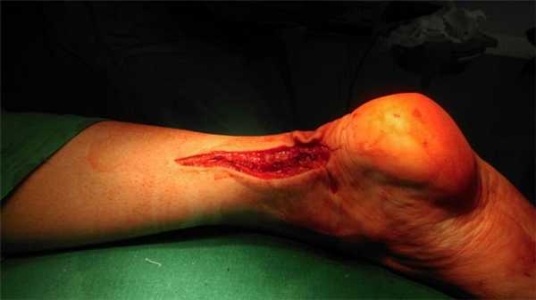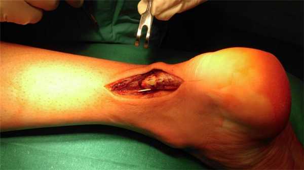 В такой ситуации дефект ахиллова сухожилия может быть даже больше чем при обычном застарелом разрыве, так как дистальный конец сухожилия дегенерирует и кроме того производится резекция небольшого участка пяточной кости, для того чтобы подготовить «посадочную площадку» для сухожилия.