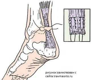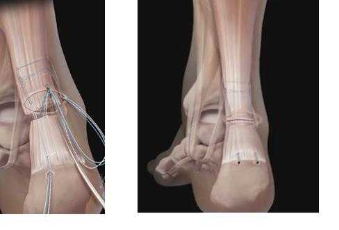 Операция при отрыве ахиллова сухожилия от пяточной кости.