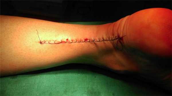 Внешний вид задней поврехности голени непосредственно после ушивания раны.