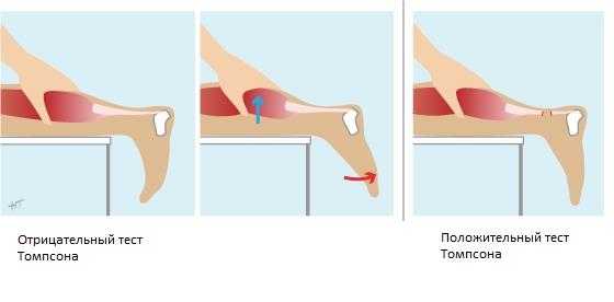 - Специфические тесты - например тест Томпсона, когда при сжатии брюшка икроножной мышцы происходит небольшое подошвенное сгибание стопы.