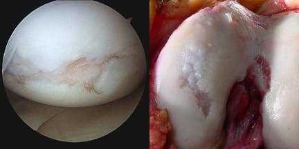 А так выглядит пораженный сустав через артроскоп. Обратите внимание на площадь отсутствия хрящевой поверхности.