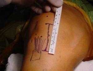 - Хирург делает небольшой (до 10 см) разрез мягких тканей через переднюю поверхность и аккуратно обнажает поврежденный сустав.