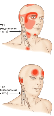 - В грудинной головке ГКСМ обычно имеется 4 ТТ, которые могут вызвать такие проблемы, как птоз, затуманенное зрение, головные боли в пазухах, а характер боли более поверхностный и вызывает боль в затылке, горле, глазу, пазухе, щеке, брови.