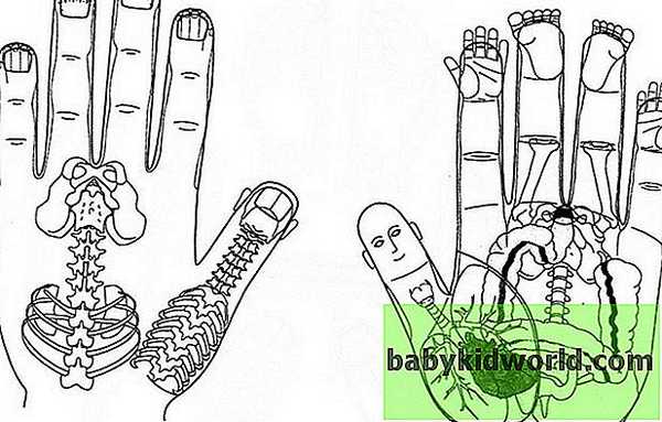 Руки и ноги представлены пальцами, где руки - это указательный и мизинец, а ноги - средний и безымянный. Такие же рефлекторные точки есть на стопе.