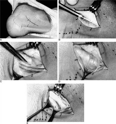 Для хорошей визуализации рекомендуется использование жгута. Выполняется полукруглый разрез параллельно заднему краю внутренней лодыжки. Необходимо аккуратно выделить сосудисто-нервный пучок и взять его на держалку. Доступ к сухожильному каналу можно осуществить как спереди так и сзади по отношению к пучку. На этом этапе возможно выделение сухожилия, после его тщательного осмотра и пальпации, удаляются все узлы, спайки. При обнаружении треугольной кости необходимо её удалить.