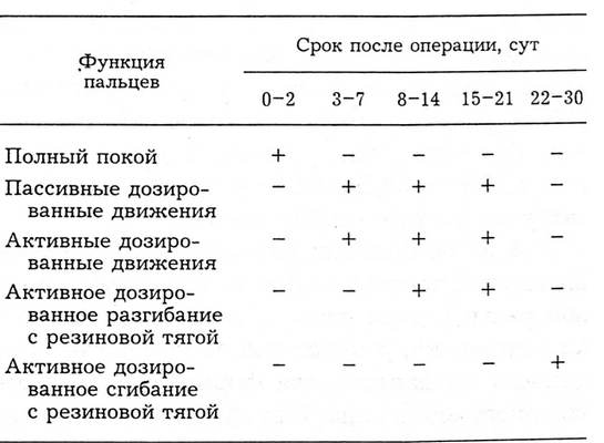 Используемая нами схема послеоперационной реабилитации представлена в табл. 1. При удовлетворительном общем состоянии больного и отсутствии осложнений со стороны раны со 2—3-го дня после операции больному разрешаем (под контролем врача) активные движения в суставах оперированной кисти. При этом обращаем внимание на необходимость разработки движений в каждом суставе оперированного и смежных пальцев. В первую очередь это касается дистального межфалангового сустава, поскольку из-за рубцового блока трансплантата на уровне средней фаланги здесь чаще всего возникает сгибательная контрактура. Предупреждает ее разработка движений в положении максимальной релаксации реконструированного сухожилия (кисть и пястно-фаланговый сустав приводим в положение сгибания, после чего выполняем мягкие редрессирующие движения в сторону разгибания в дистальном и проксимальном межфаланговых суставах). После этого больной выполняет до 10 медленных движений с максимальной амплитудой в каждом межфаланговом суставе при стабилизации проксимальной фаланги.