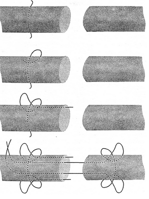 Предложено более 50 видов шва сухожилий. Чаще всего используют методику наложения шва по Кесслеру и ее модификации. Во время пластики основное требование к сухожильному шву — достаточная прочность, чтобы активные движения со 2—3-го дня после операции не привели к деформации или разрыву анастомоза. Мы используем шов по методике клиники, этапы которого представлены на рисунке. Он надежен, поскольку в отличие от других швов через область анастомоза проходят 4 нити. Это имеет большое значение в профилактике разрывов шва в послеоперационном периоде при выполнении ранних активных дозированных движений. Используются атравматичный шовный материал 4/0 и круглая игла. После внутрисухожильного шва желательно наложить адаптирующий непрерывный шов анастомоза нитью 6/0.
