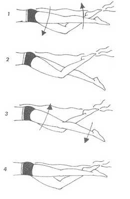 - Сядьте и обопритесь на предплечья. Вытяните ноги и начните совершать ими попеременные движения навстречу, поднимайте и опускайте их. Та же техника движения используется в процессе плавания.