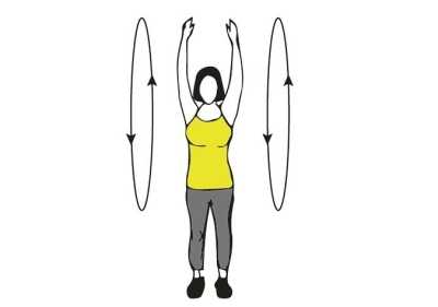 - Встаньте и разведите руки по сторонам, ладони оберните назад. Сделайте кистями и предплечьями круговые движения. При этом локти должны оставаться в прежнем положении. Движения напоминают плавание на спине.