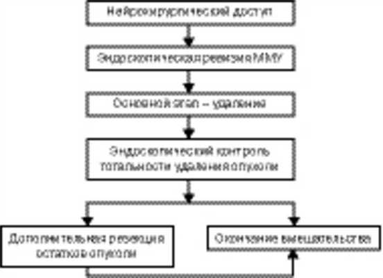 Рисунок 2. Алгоритм проведения ЭА. Следует отметить, что первичная инспекция образований данной локализации возможна только при размерах опухоли не более 20 мм. Также применение эндоскопической техники при удалении опухолей больших и гигантских размеров нередко затруднено ввиду выраженного кровотечения. Поскольку существующий инструментарий не позволяет выполнить эффективный гемостаз при использовании только эндоскопа, хирургу приходится возвращаться к стандартной микрохирургической методике. Более того, изначально подразумеваемый субтотальный характер вмешательств в случае большого размера опухоли делает применение ЭА нецелесообразным.